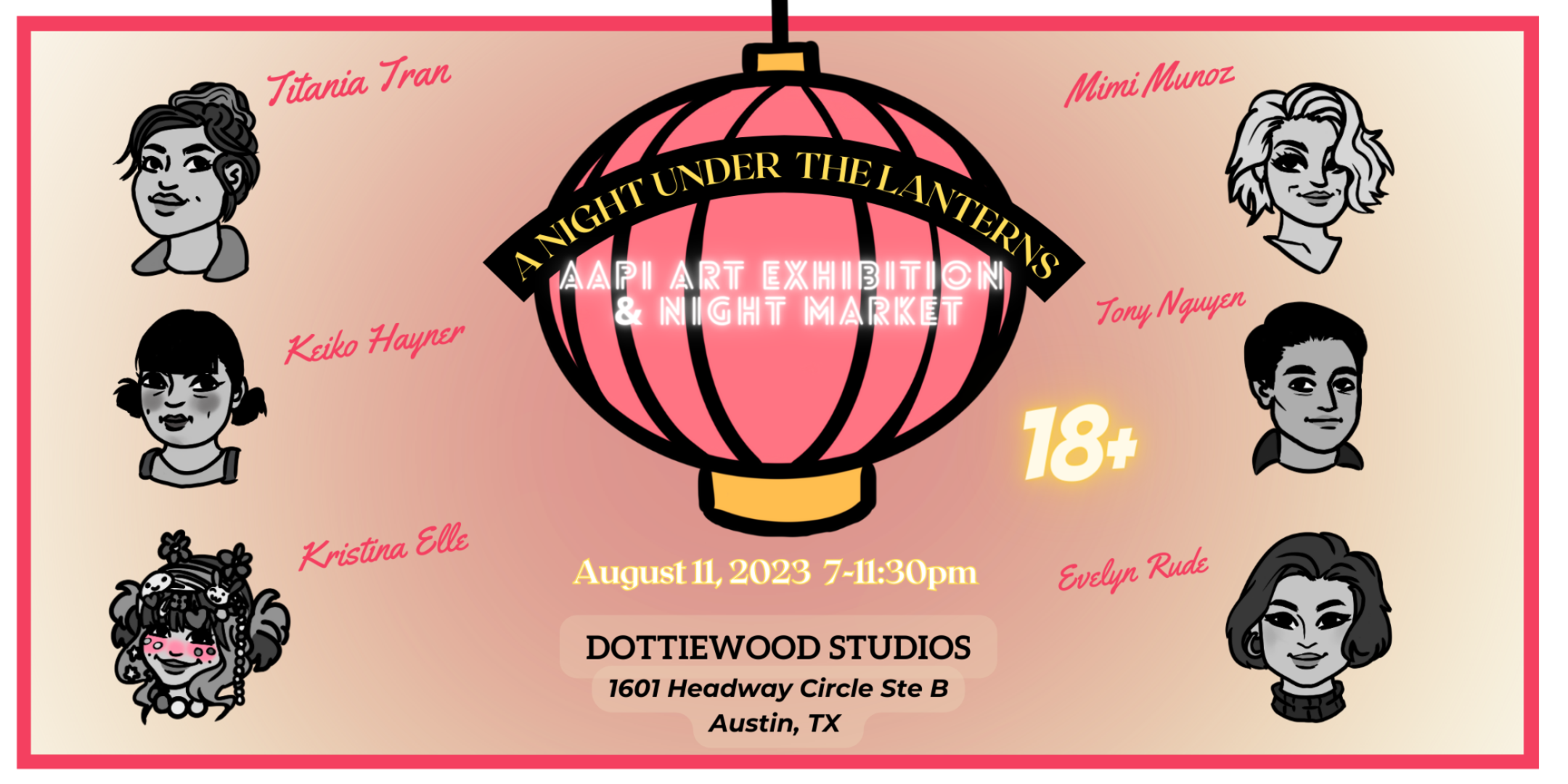 DESCRIPTION:The Greater Austin Asian Chamber of Commerce is a proud sponsor of this event. This exhibition and night market is an open event to celebrate all of the AAPI artists and businesses in Austin and surrounding areas. The event will be held on August 11\, 2023 at Dottiewood Studios (A 10\,000 sq ft production/event space!) What makes this event so special is that it will be illuminated by paper lanterns and visitors will be able to interact through the whole space at night! It'll be a gorgeous intimate moment for everyone! There will be an interactive Art Gallery\, Indoor night market\, free drinks provided\, and a food truck court outside! The AAPI event of the summer!REGISTER FOR FREE ON EVENTBRITE\nSpace provided by: https://www.dottiewoodstudios.com/ Featured Artists and Vendors:Evelyn Rude (Artist)Kristina Elle (Artist) Tony Nguyen (Artist)Keiko Hayner (Artist)Mimi Tuevo (Artist) Titania Tran (Artist)Kale Label (Vendor)Okasan Vintage (Vendor)Lian.Soy (Vendor)Solid Soaps (Vendor)Year901 (Vendor)Mama Kong Cambodian (Vendor)Thank you to our sponsors and providers!\nGreater Austin Asian Chamber of Commerce\nDrink SanzoREGISTER FOR FREE ON EVENTBRITE