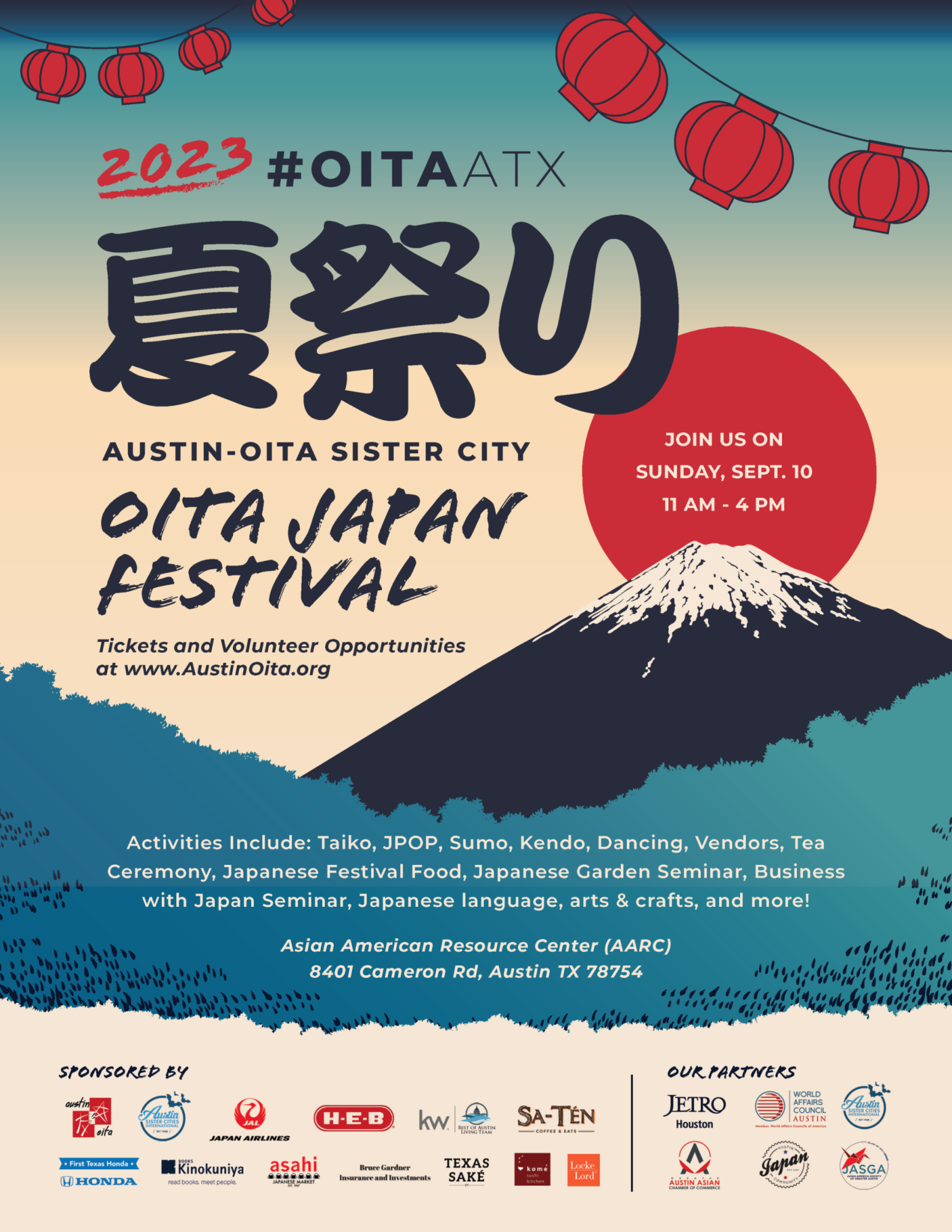 DESCRIPTION:Doing Business With JapanIn partnership with JETRO Houston and the Austin-Oita Sister City Committee (AOSCC)\, the Greater Austin Asian Chamber of Commerce will host an International Market Briefing all about doing business with Japan. In this fun and informative atmosphere\, you will learn about Japan's investment dynamics in the United States\, hear success stories\, create connections\, and cultivate opportunities with Japan for Central Texas businesses.This seminar takes place during the 2023 Oita Japan Festival at the Asian American Resource Center.\n\nWhen: 1:00   2:00 PM\nWhere: Asian American Resource Center (AARC)\, Room 4.\nParking is available at the venue with overflow parking at 1520 Rutherford Lane. (click for map and directions).\n\nREGISTER HERE\nAbout The 2023 Oita Japan Festival Celebrate the culture of Japan at the Oita Japan Festival! Explore Japanese food and drinks\, kids' activities\, cultural education & more! Get your tickets HERE. \n\nThe Austin-Oita Sister City Committee seeks to promote and heighten public interest in and appreciation of the culture\, people\, languages\, business\, and products of the city of Austin\, Texas and Oita\, Japan. As communities expand and thrive\, the Committee has also expanded its reach to include the Central Texas region and Oita Prefecture in its mission.\nFestival ScheduleDoors open at 11 am\; Performances and seminars 12-4 pm"Doing Business with Japan" GAACC International Market Briefing 1-2 pm\n\nFESTIVAL HIGHLIGHTS:\n- Silent Auction featuring 2 pairs of tickets to Japan donated by Japan Airlines!\n- AMAZING Special Guest Taiko Player from Oita's Tesshin Daiko\n- Oita Products Booth\n- Austin Taiko\n- The Japanese Way of Tea with Central Texas Chado with Rhonda Rolf\n- Texas Sake\n- Dark Circle Sumo\n- Minyo Dancers\n- Austin Kendo\n- Food from Kome\n- Snacks from Asahi Imports\n- "Doing Business in Japan" Seminar hosted by the Greater Austin Asian Chamber of Commerce\n- "Experience Japan" Tables hosted by AJC\n- Matcha Tea Experience hosted by AJC\n- Japanese Language hosted by JASGA\n\n...and MORE!\nREGISTER HERE\n\n\n\n GAACC Corporate Sponsors & PartnersThe generous support of these sponsors and partners allows GAACC to continue delivering programs to members and to the public with the mission of Serving Local while Thinking Global\, and to support our members through advocacy\, education\, and connections.\nTHANK YOU!